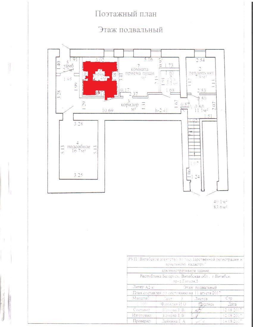 Лот №3 Право на заключение договора аренды сроком на 3 года помещения площадью 10,4 кв. м., расположенного в подвале капитального строения с инв.№200/С-74478 по адресу: Витебская обл., г. Витебск, проезд Гоголя, 5 (наименование – административное здание, назначение – не соответствует фактическому назначению). Размер коэффициента к базовой ставке арендной платы равен 3. Целевое использование: для размещения офисов, складских помещений, оказания услуг, организации производства (кроме вредных производств).