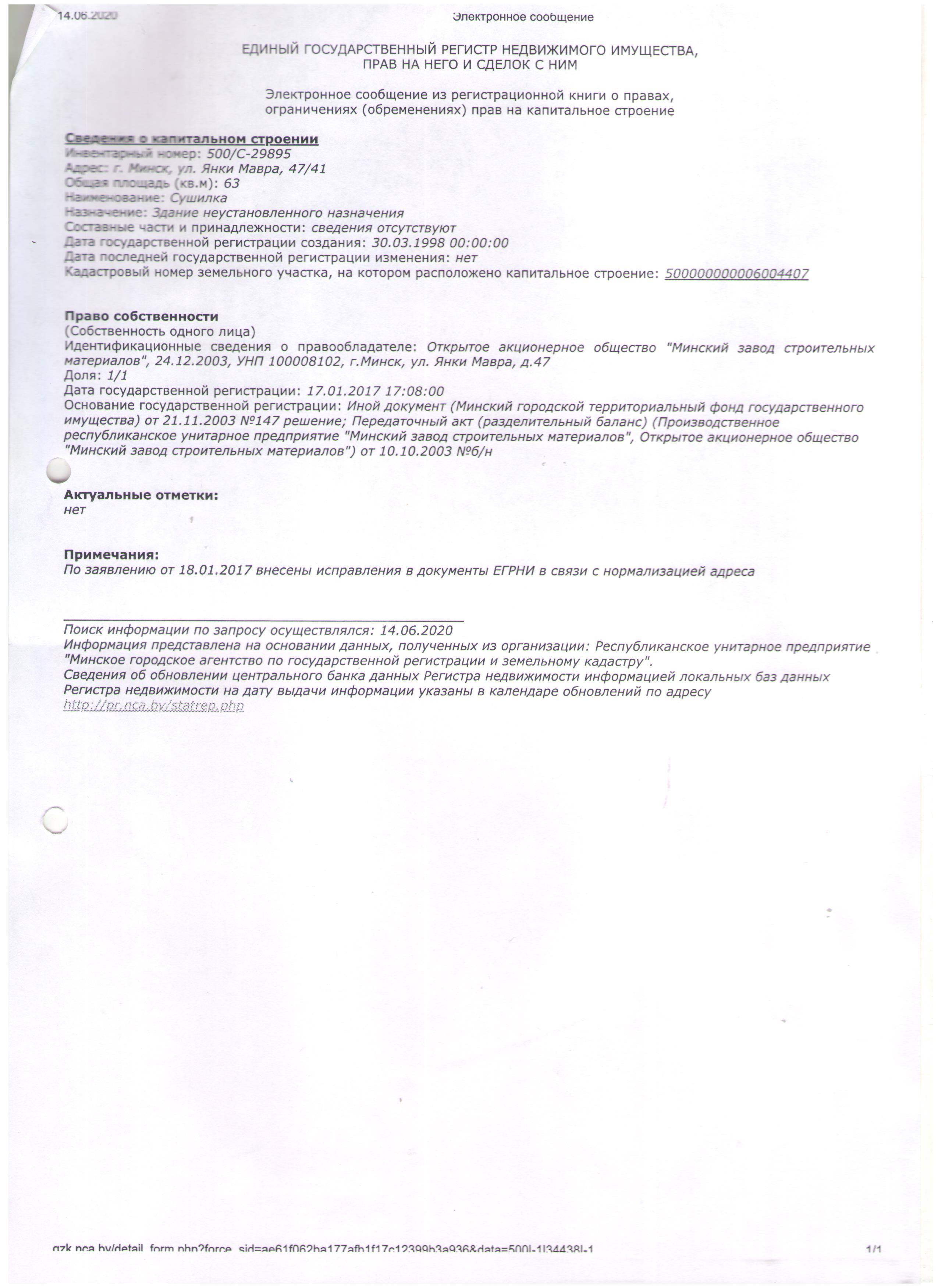 1. Капитальное строение с инв.№500/С-29895, наименование - сушилка, назначение - здание неустановленного назначения, общей площадью 63 кв.м., по адресу: г.Минск, ул.Янки Мавра, 47/41, на земельном участке с кадастровым номером 500000000006004407. (В определении Экономического суда г.Минска лот числится за № 2/03-2020).