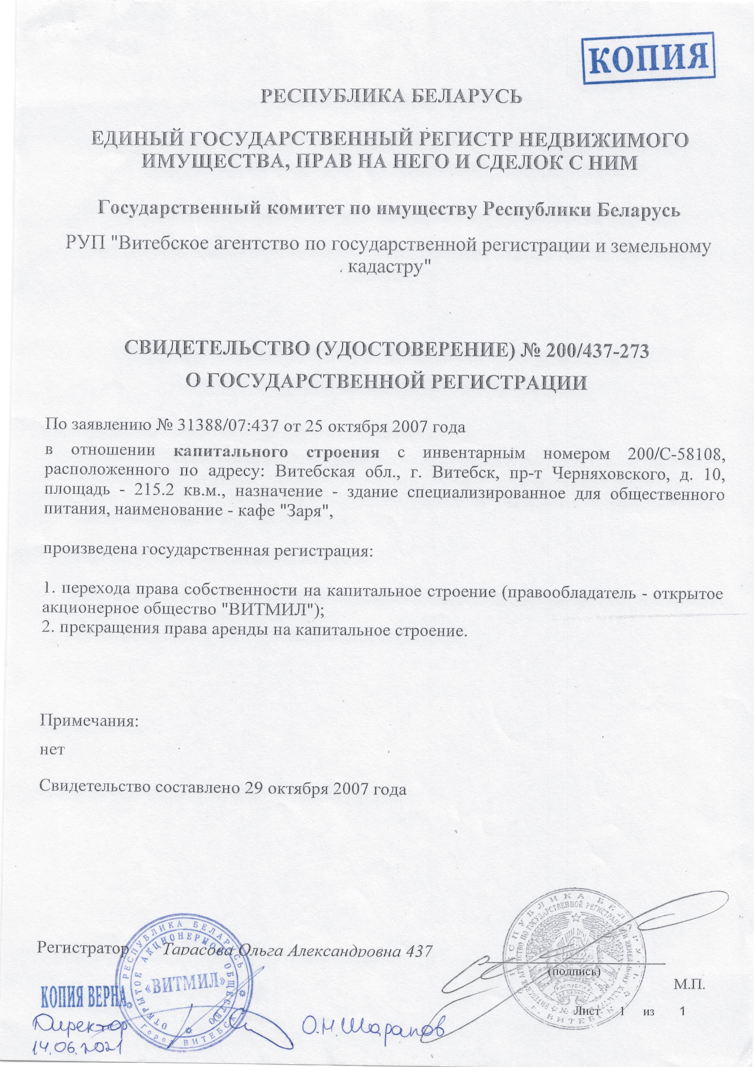 Лот №1. Капитальное строение с инв. №200/С-58108, расположенное по адресу: Витебская обл., г.Витебск, пр-т Черняховского, д.10, площадью 215,2 кв. м., назначение – здание специализированное для общественного питания, наименование – кафе «Заря». Имущество расположено на земельном участке с кадастровым номером 240100000003000370, площадью 0,0393 га, предоставленном Продавцу на праве постоянного пользования для обслуживания кафе «Заря».