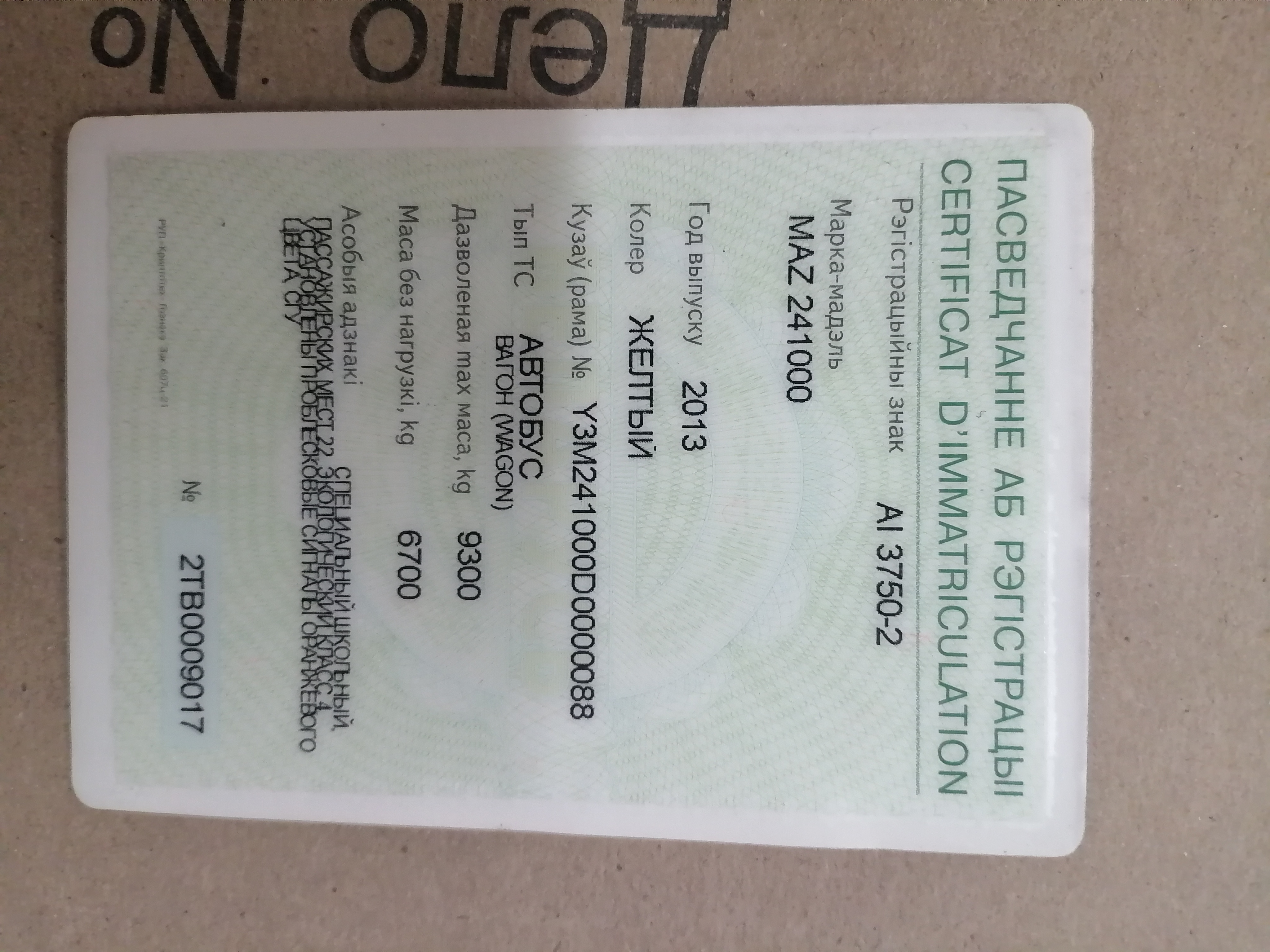 | Описание имущества | Лот № 1. Автобус МAZ 241000, 2013 года выпуска, регистрационный знак АI 3750-2, тип ТС – автобус, вагон (WAGON), цвет – желтый, кузов (рама) № Y3М241000D0000088, инв.№ 01510028 |