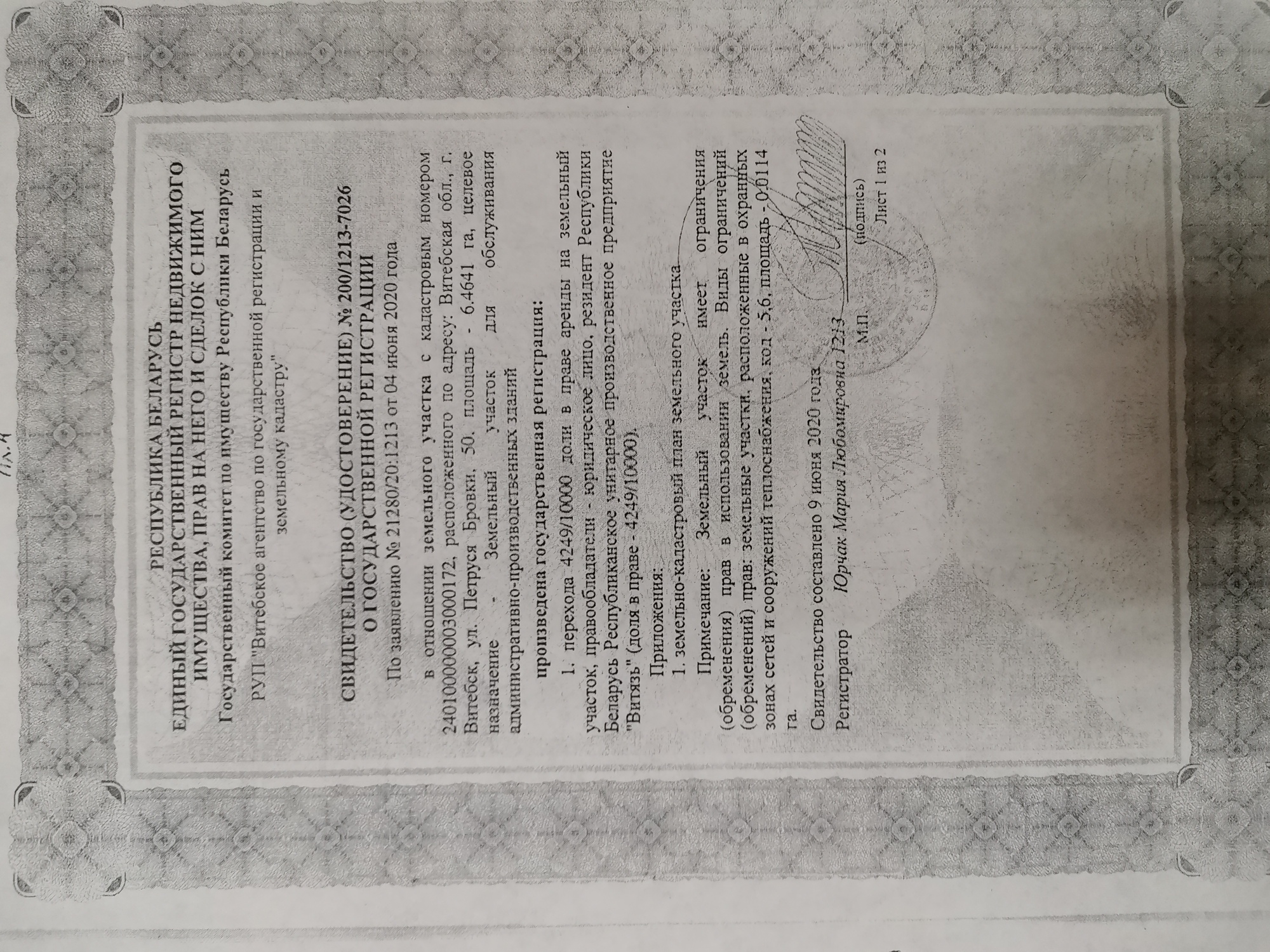 Земельный участок с кадастровым номером 240100000003000172 по адресу: Витебская обл., г. Витебск, ул. Петруся Бровки, 50 (общее долевое право аренды), целевое назначение зем. участка – зем. участок для строительства и обслуживания административно-производственных зданий и сооружений.